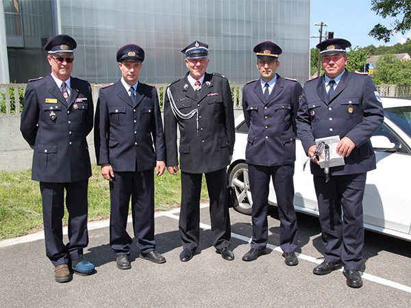 der deutschen Partnerwehr aus Zerpenschleuse mit ihrem Wehrführer D. Schalow und dem Kreisbrandmeister des Barnim S. Salavat.