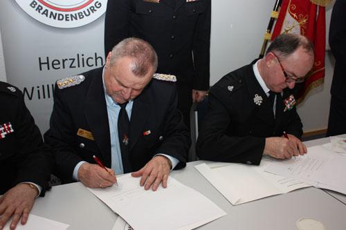 Die Unterzeichnung der Freundschaftsverträge durch die Vorsitzenden Edward Fetko (Verband der Freiwilligen Feuerwehr Wojewodschaft Lebuser Land),